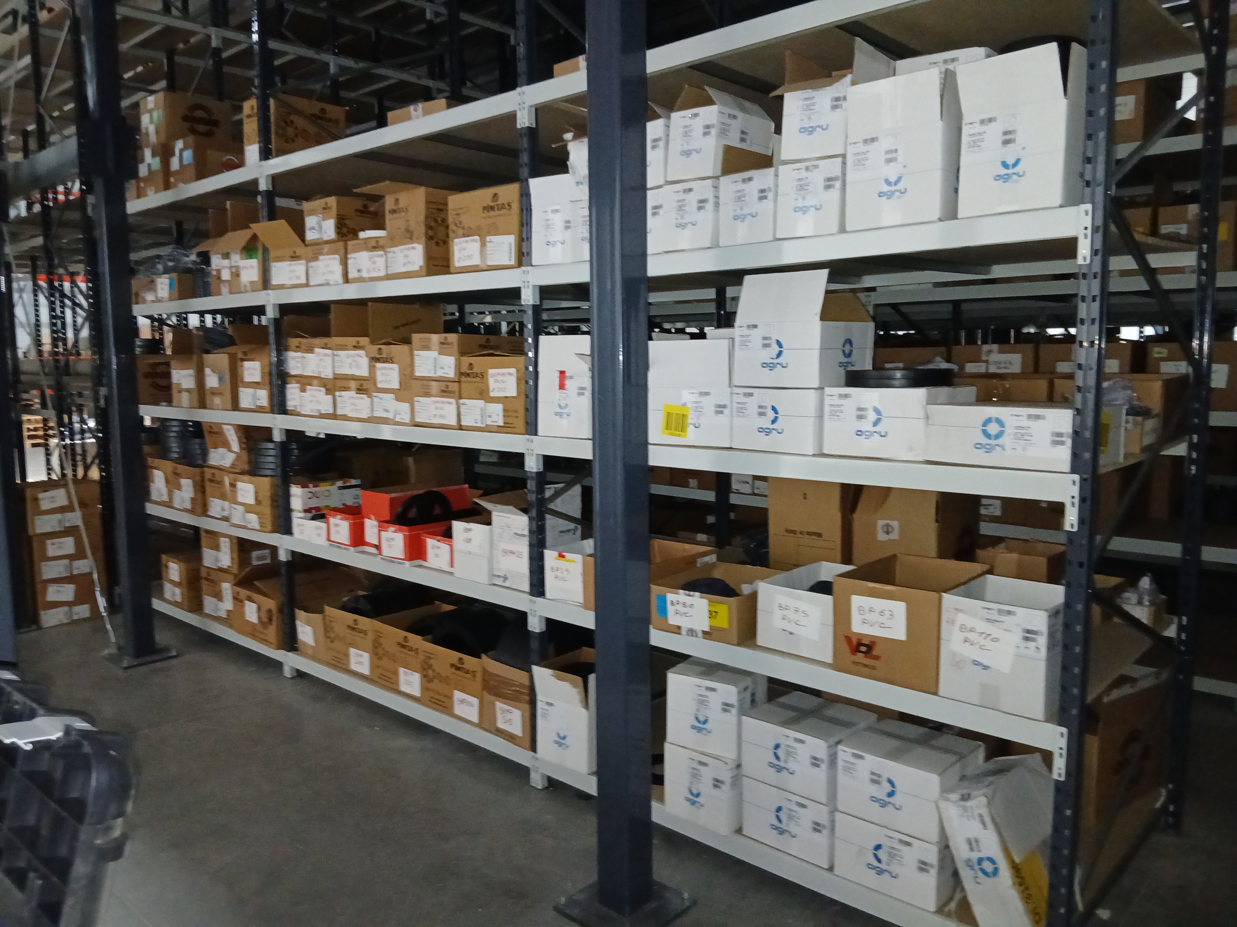 - Des raccords et pièces en PVC (coudes, tés, réductions) classés par diamètre, des petites pièces en boîtes Agru, Praher Plastics ou Pimtaş jusqu'aux grands coudes gris disposés en rang.