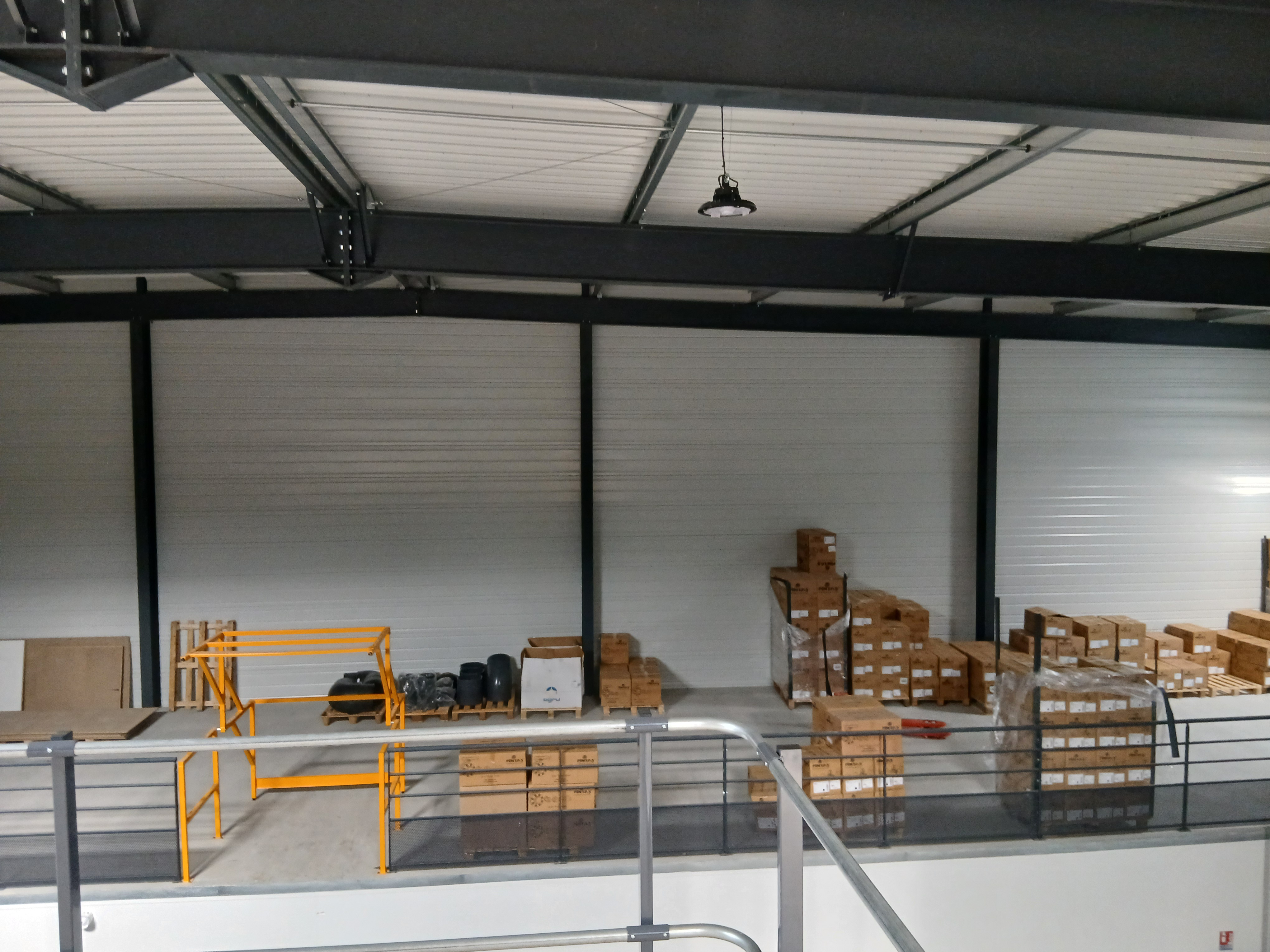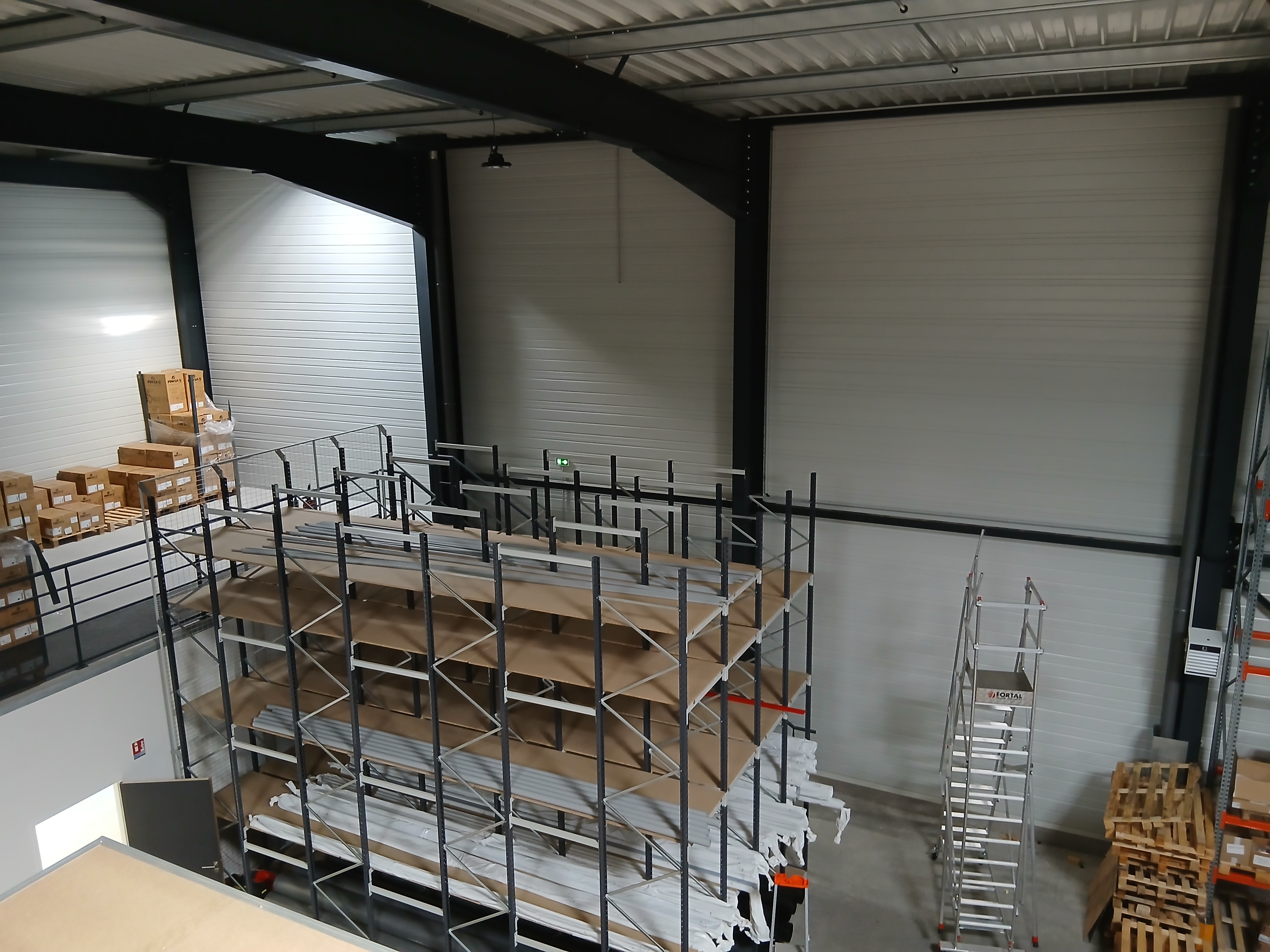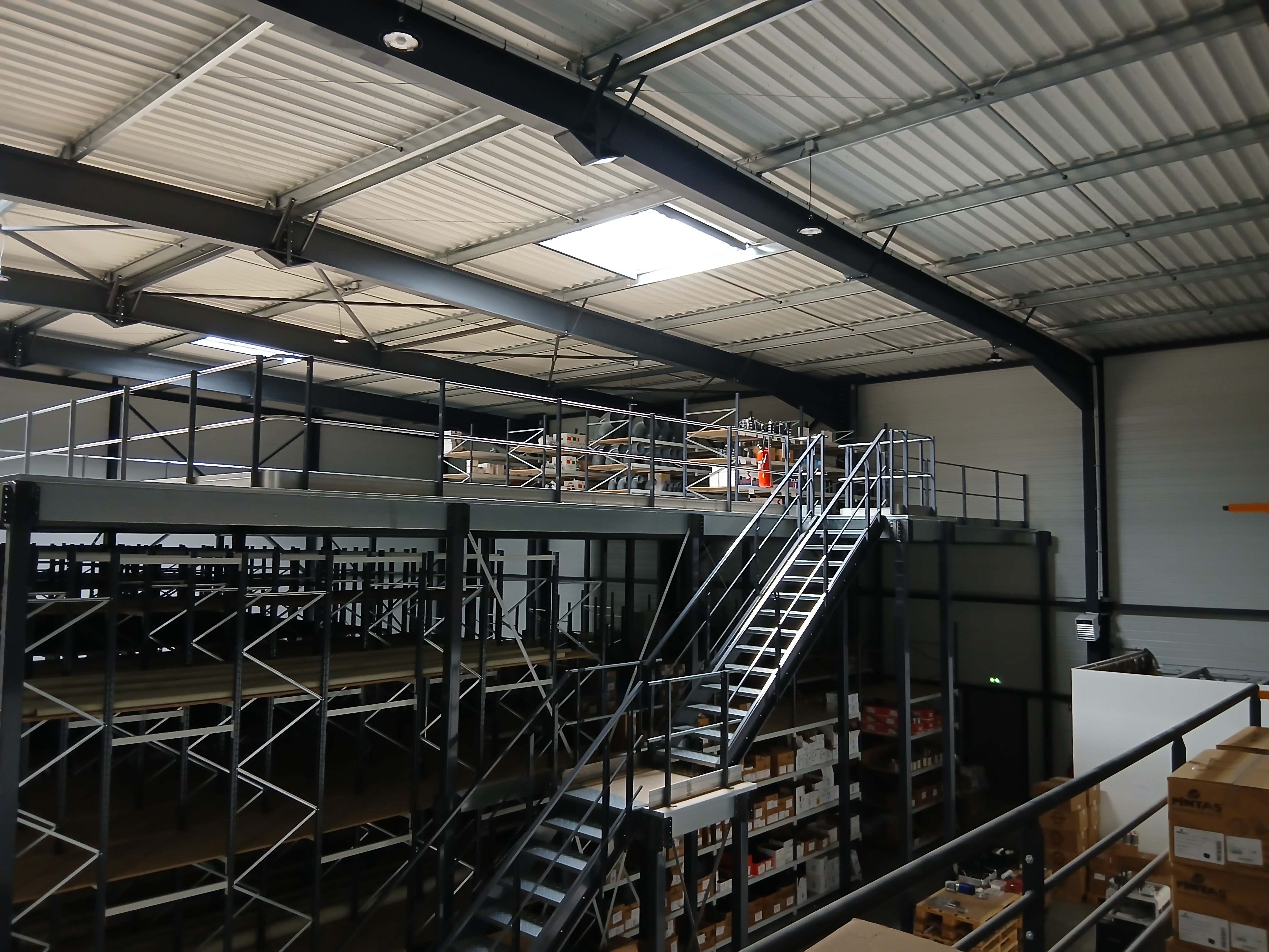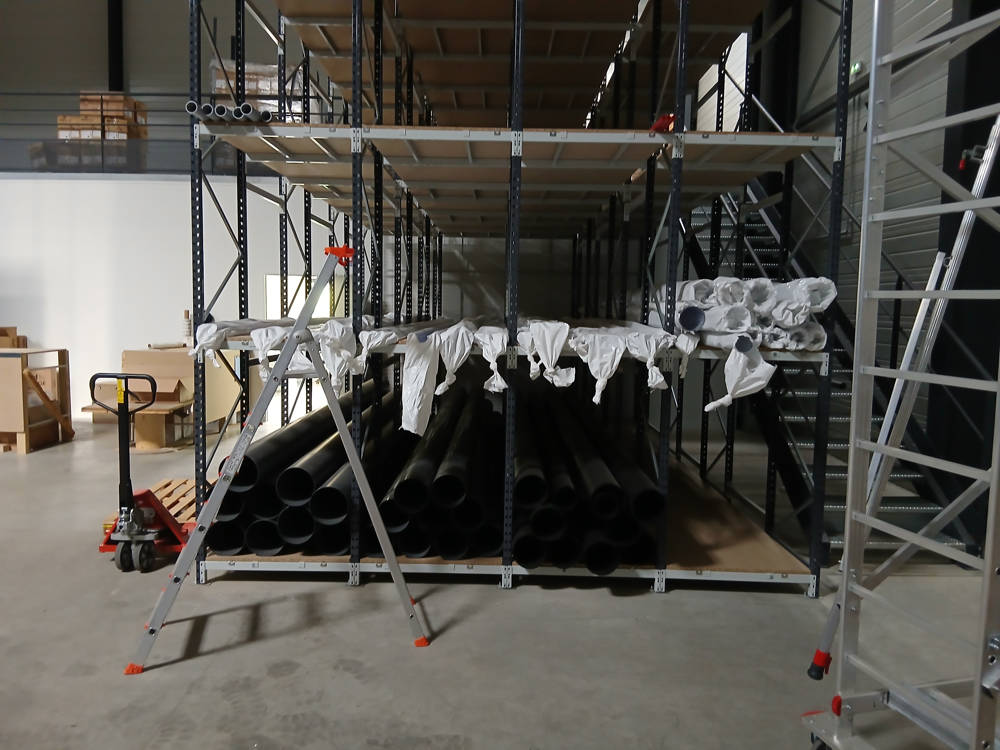 Le cœur de l'entrepôt est dominé par une imposante structure de rayonnages à plusieurs étages, accessible par un escalier métallique. Cette mezzanine généreuse permet de multiplier la surface de stockage utile sans augmenter l'emprise au sol, et accueille tubes, profilés et pièces de toutes dimensions.