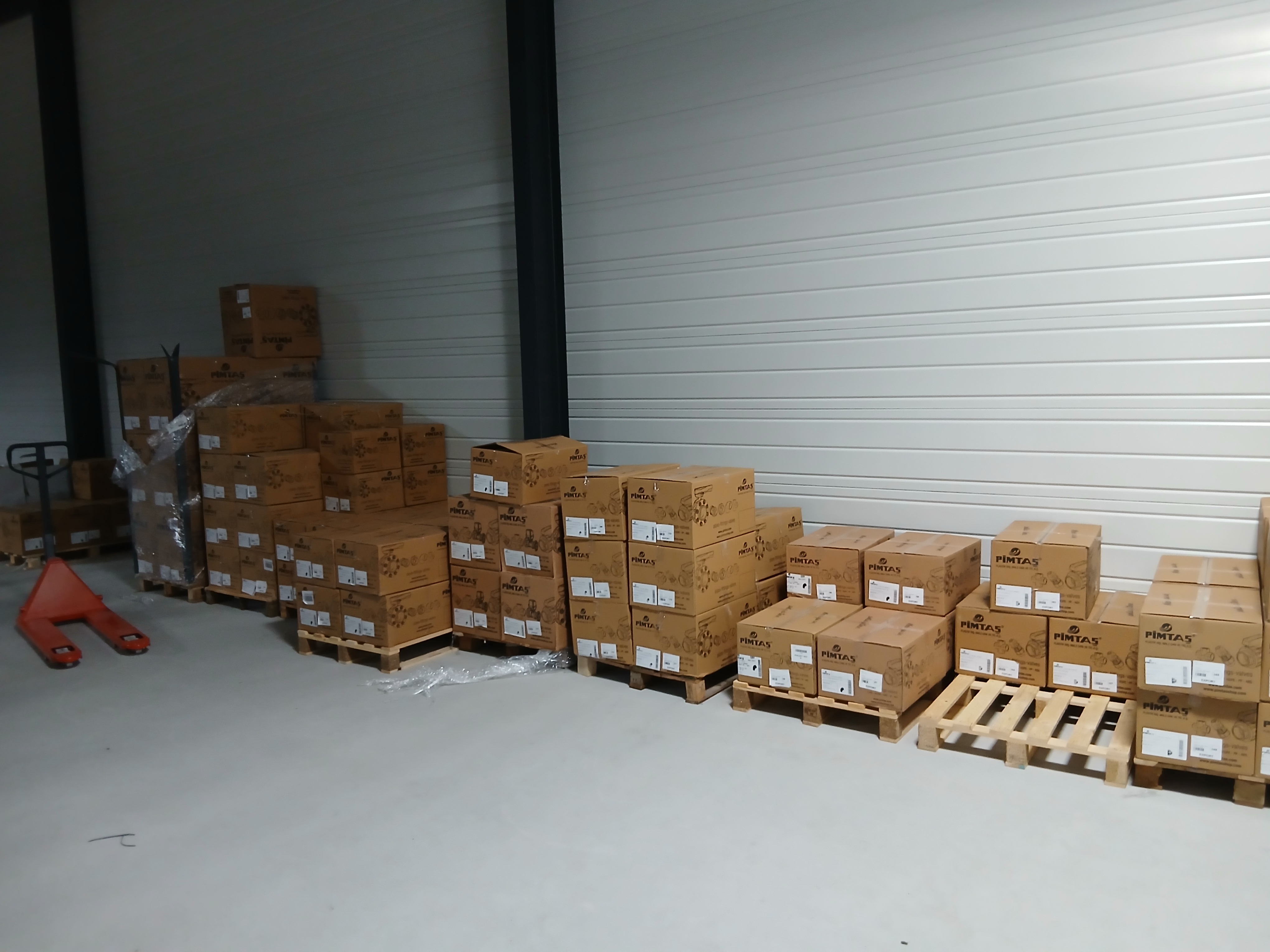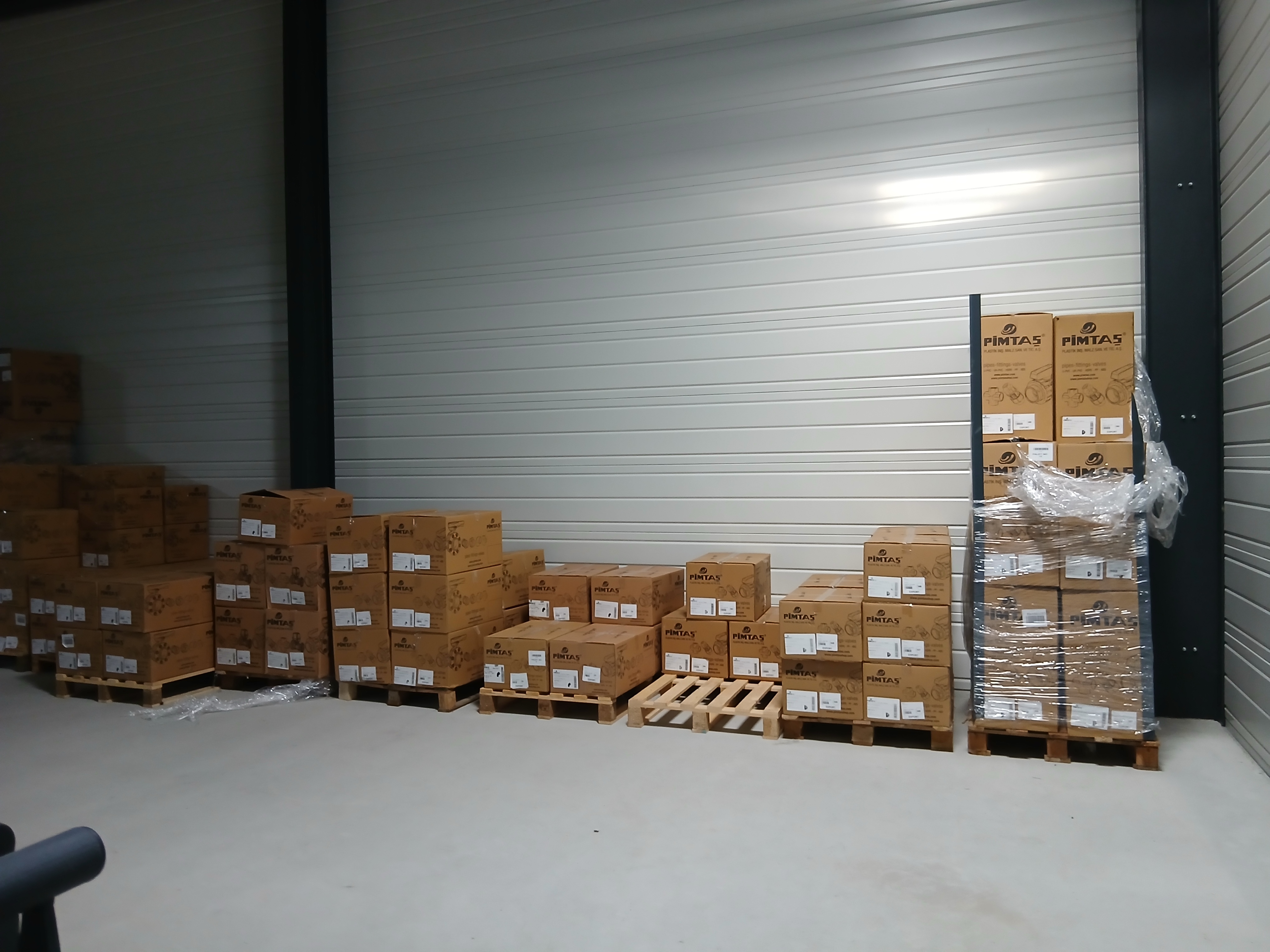 Près des quais, plusieurs palettes de cartons Pimtaş fraîchement reçues attendent d'être rangées. C'est ici que transitent toutes les nouvelles livraisons avant leur mise en stock définitive, un point névralgique de notre organisation logistique.