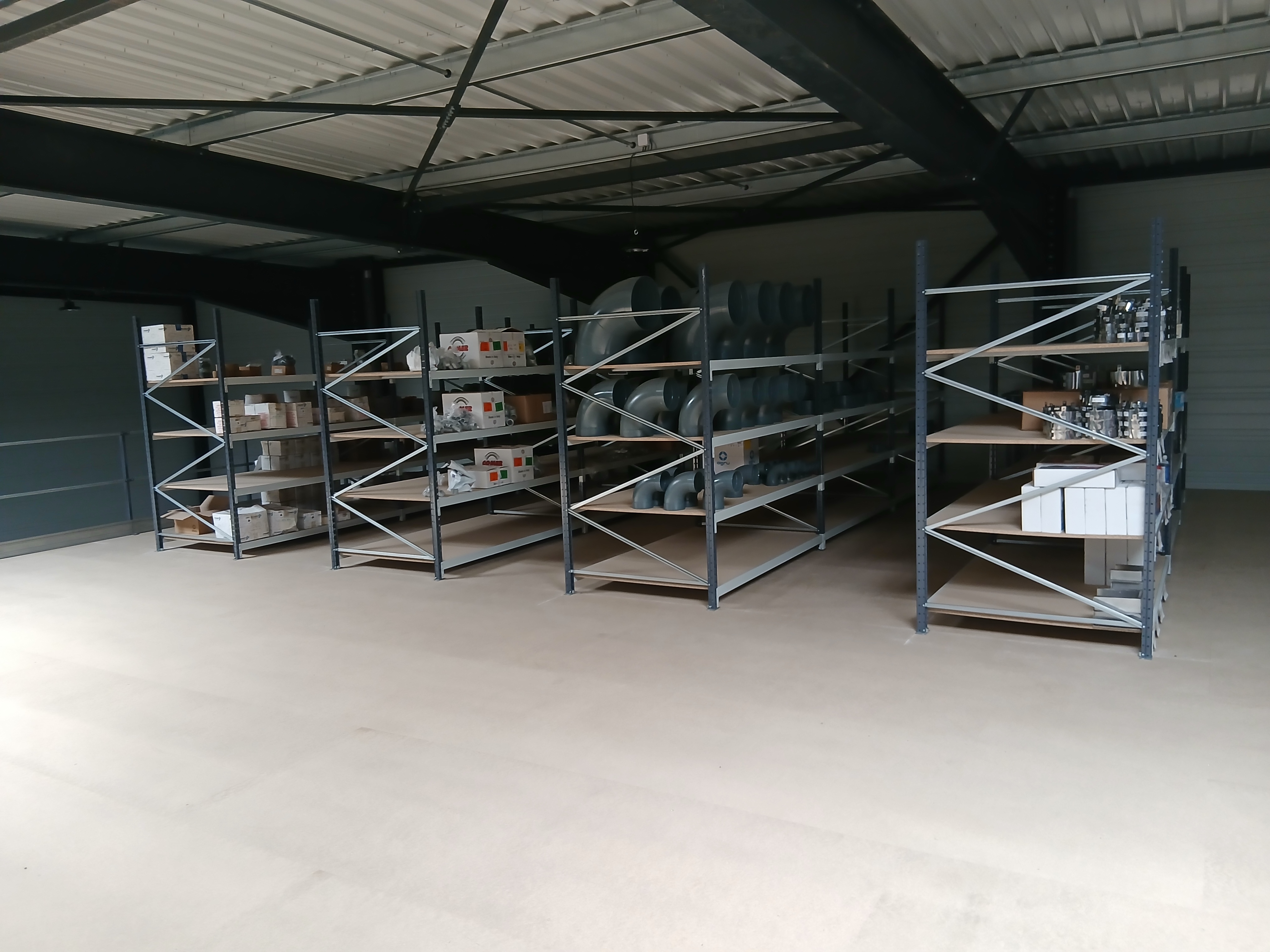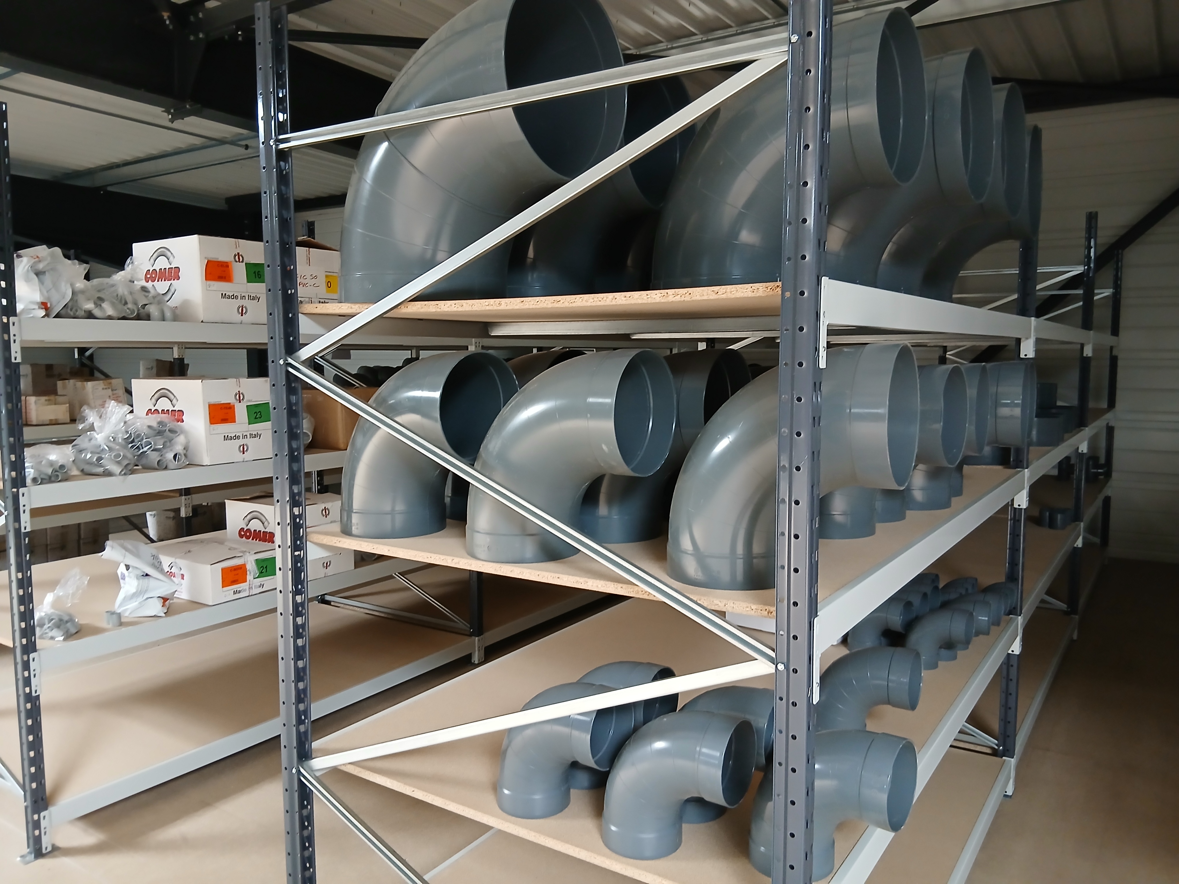 - Des joints et colliers (séries JPS) rangés par taille de Ø20 à Ø200, dans des boîtes clairement identifiées à la main.