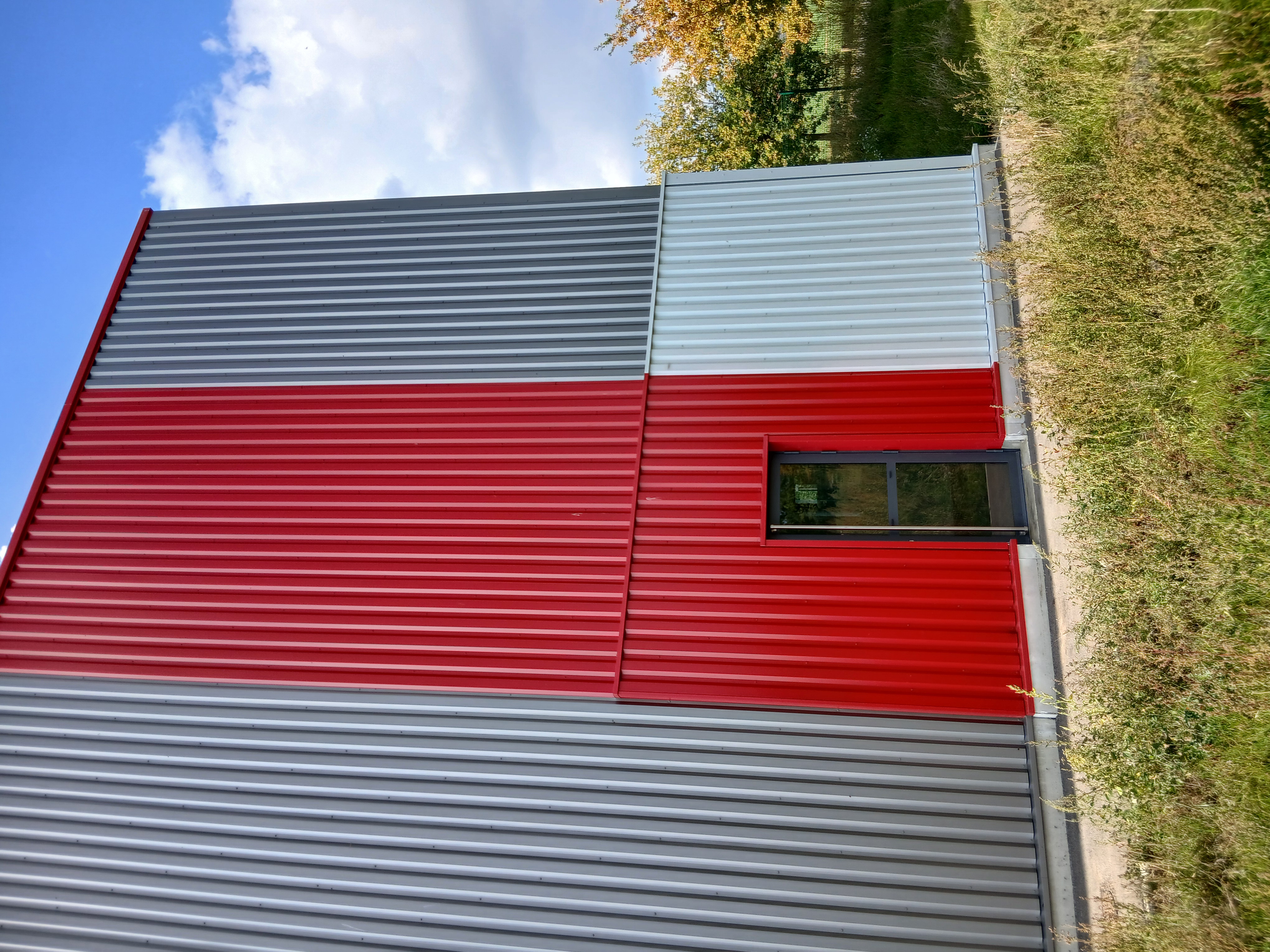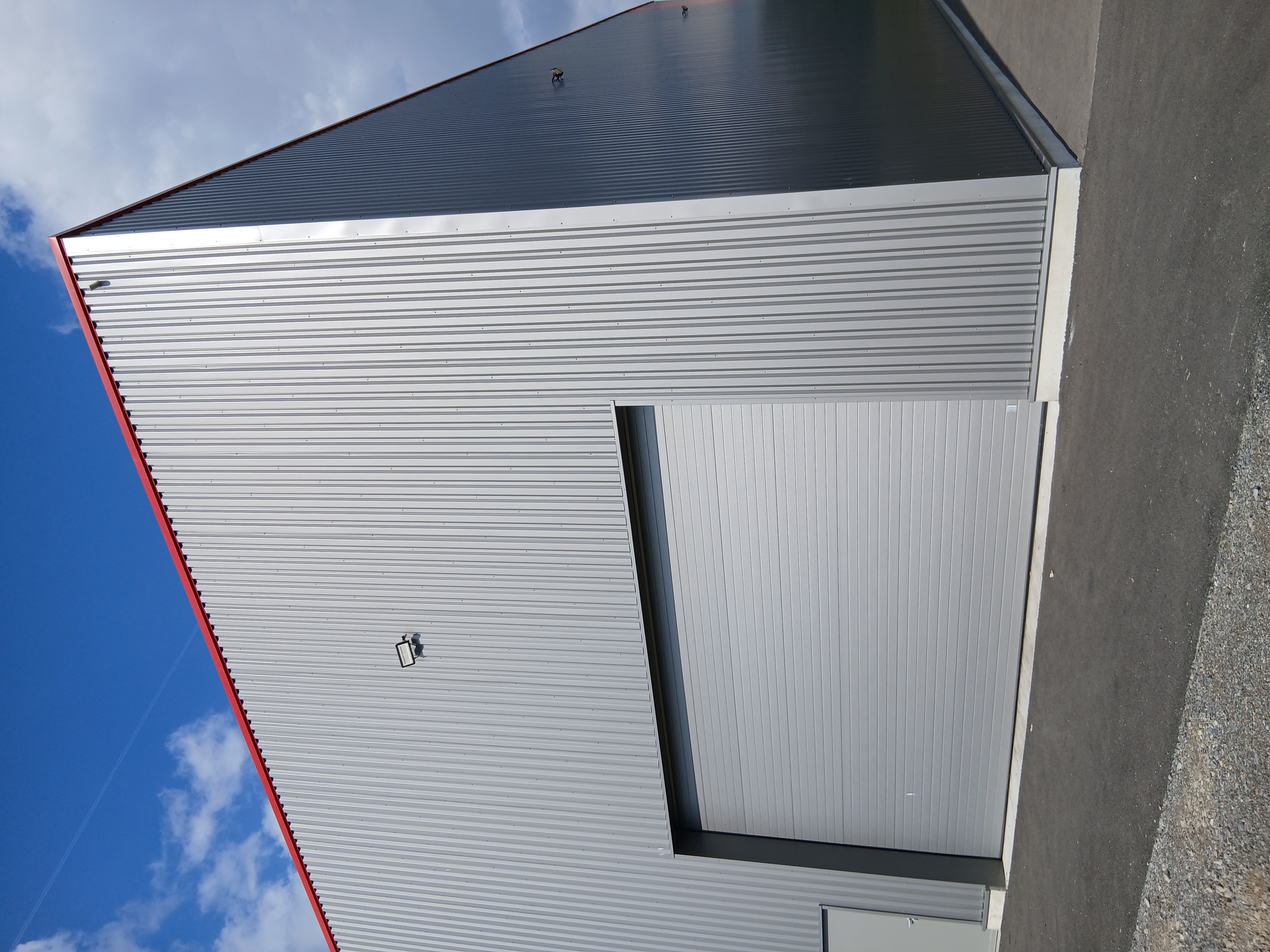 Dès l'extérieur, notre entrepôt affiche une architecture industrielle contemporaine, avec sa façade en bardage métallique gris et rouge. Deux accès distincts permettent d'assurer la fluidité des flux : une grande porte sectionnelle pour les livraisons et une entrée piétonne pour le personnel.