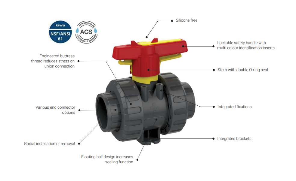 Cette vanne à bille en PVC/EPDM est un choix idéal pour assurer une étanchéité optimale et une installation flexible. Sans silicone, elle est conçue pour répondre aux exigences des environnements sensibles et techniques. Voici le descriptif de cette vanne à boisseau sphérique 2 voies M1 :